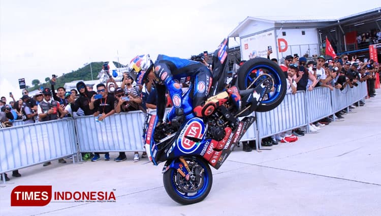 TIMES Klaten/Pembalap PATA Yamaha Brixx Toprak Razgatlioglu melakukan atraksi stopie ban depan usai memenangi race 1 WSBK Mandalika 2022, Sabtu (12/11/2022). (FOTO: Tria Adha/TIMES Indonesia).