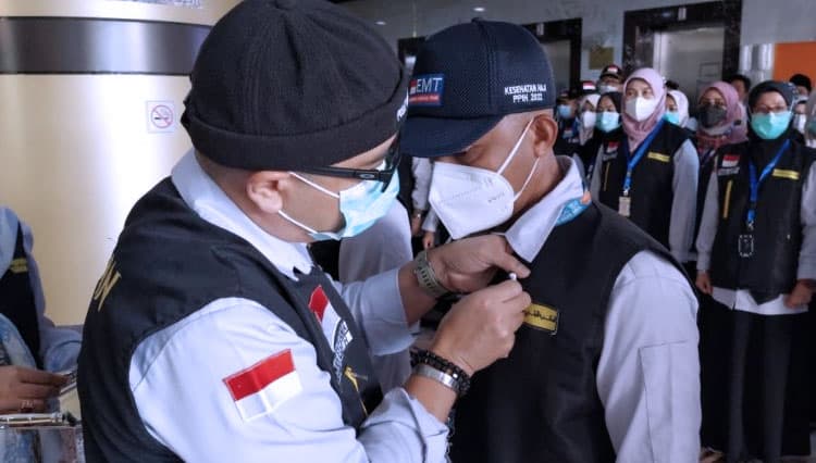 TIMES Klaten/Kapuskes Haji Kemenkes Budi Sylvana saat menyematkan pin kepada petugas kesehatan haji. (FOTO: dok. Kemenkes)